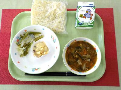 今日の給食は「コーン味噌ラーメン・茎わかめサラダ・リンゴとおさつのベリーカップケーキ・牛乳」でした。