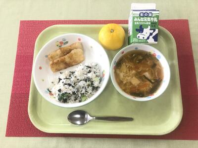 今日の給食は「イカのかりん揚げ・わかめ菜めし・かき玉汁・みかん・牛乳」でした。