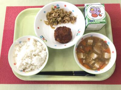 今日の給食は「味噌カツ・キャベツのおかか炒め・のっぺい汁・ごはん・牛乳」でした。