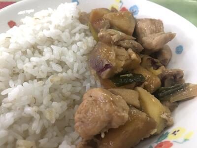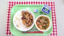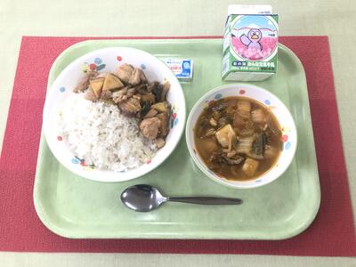 今日の給食は「焼き鳥丼・日高こま鍋汁・チーズ・牛乳」でした。