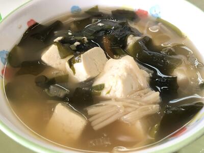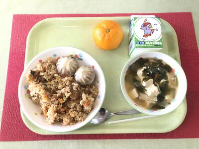 今日の給食は「小籠包・ビビンバ風炊き込みご飯・わかめスープ・牛乳・みかん」でした。