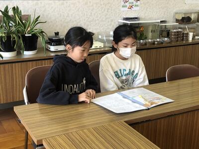 給食の時間に、給食員会の児童が「今日の給食」の放送をしてくれます。放送前には、今日の放送の練習と内容確認のために、先生の前で読むことが日課になっています。