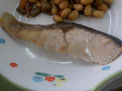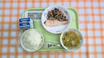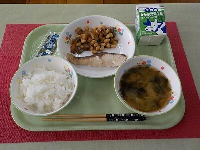 今日のメニューは「鮭の塩焼き・五目煮豆・じゃがいものみそ汁・味付けのり・ごはん・牛乳」でした。