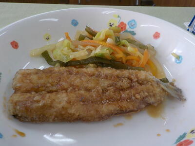 「いわしのかば焼き」は、揚げた衣付きのいわしに、甘辛いかば焼きのたれがしっとりとしみ込んだ、ご飯がすすむ一品でした。