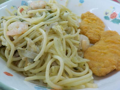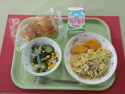 今日のメニューは「春野菜のスパゲッティ・チキンナゲット・わかめサラダ・はちみつパン・牛乳」でした。