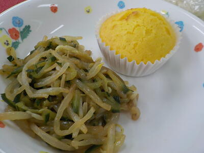 今日の給食は「チャンポン麺スープ・ホット中華麺・もやしとキュウリのナムル・キャロットカップケーキ・牛乳」でした。