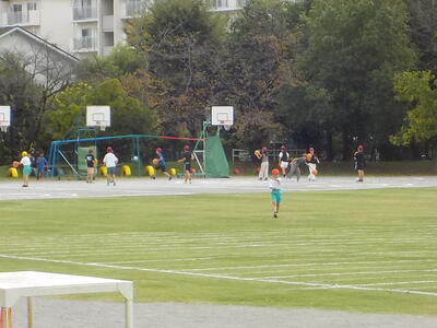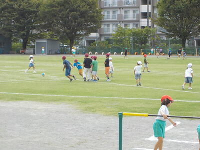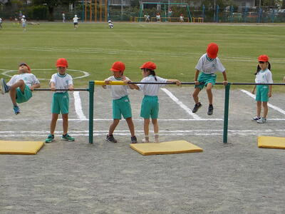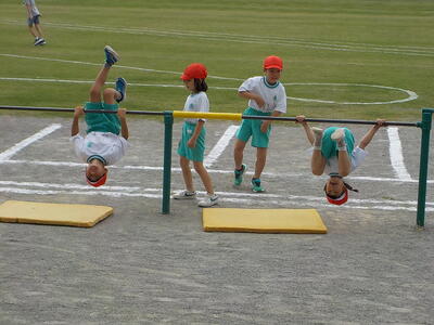 2時間目休みの様子。校庭では子供たちが元気にバスケットボール、バレーボールや鬼ごっこ、遊具などで遊んでいます。1年生たちは、体育でやっている鉄棒で遊んでいます。休み時間や子供たちが自由な時間に自分たちで選んで行う「運動の生活化」はとっても大切ですね。