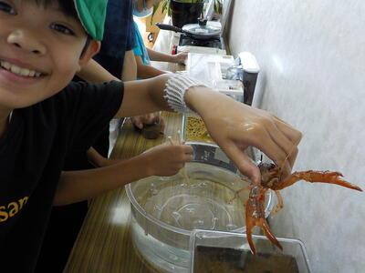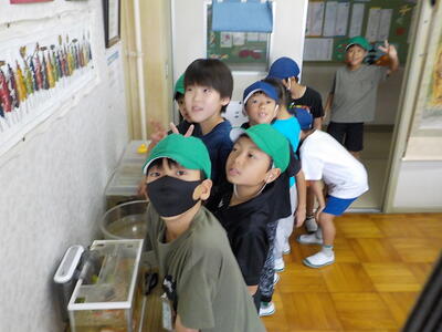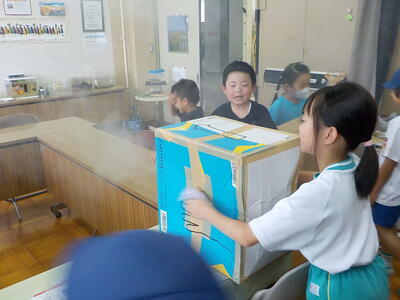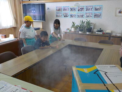 2時間目休みと昼休みには、インドア派(?)の子供たちが校長室に来てくれます。ザリガニを触ったり金魚にエサをくれたりしています。一番好きなのは「空気砲」です。グリセリンのスモークを入れると、飛んでいく空気の輪っか〇が見えるので「楽しさが倍増」します。