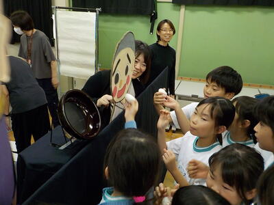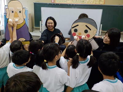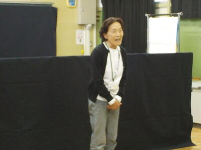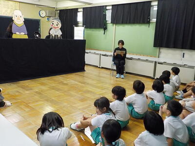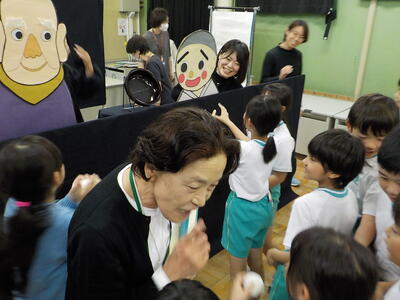 二つのお話を、大型紙芝居とペープサートで聞かせて(見せて)いただきました。