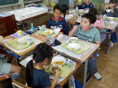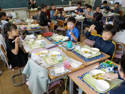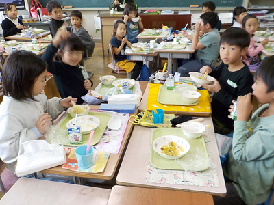 給食の時間の2年生の教室です。