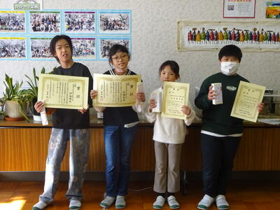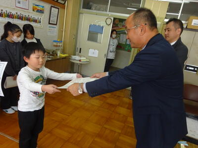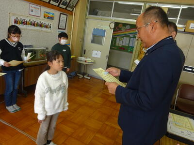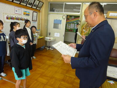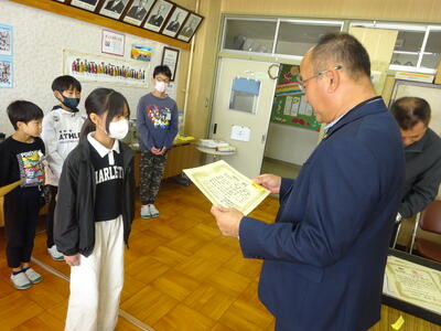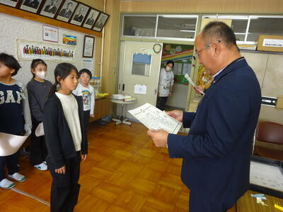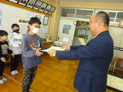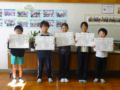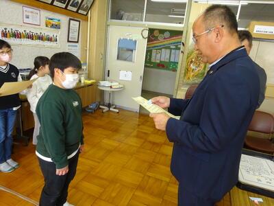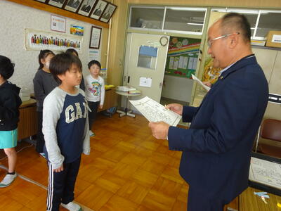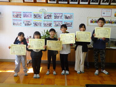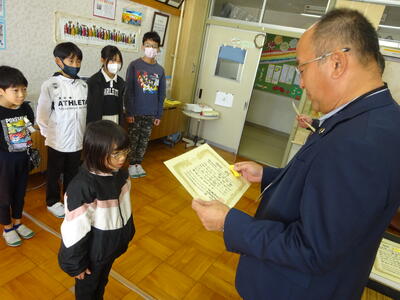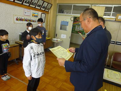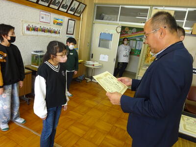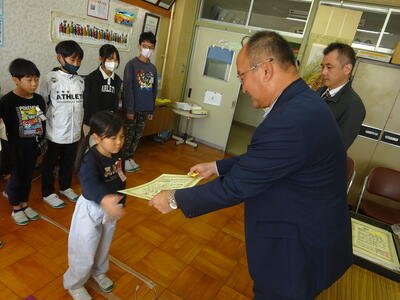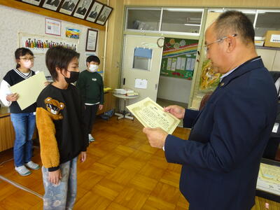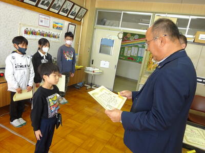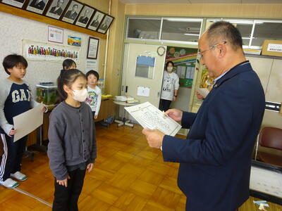 2時間目休みに校長室にて表彰を行いました。今日は「読書感想文コンクール」「発明創意くふう展」「火災予防ポスターコンクール」「郷土を描く美術展」の賞状を渡しました。
