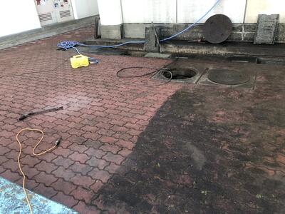 校舎裏にある赤レンガの床掃除…。なかなか作業が進みません😩。こびりついた泥やコケが思った以上に頑固で、サイクロンノズルの高圧水流でも簡単には落ちてくれません。でも何とか今日中には終わらせたいです。