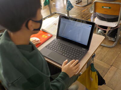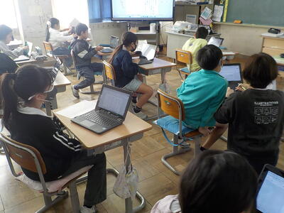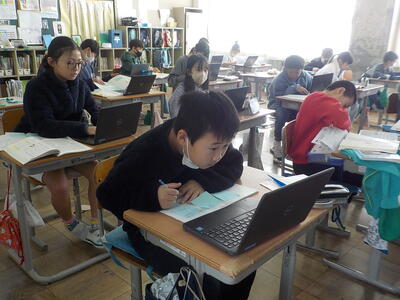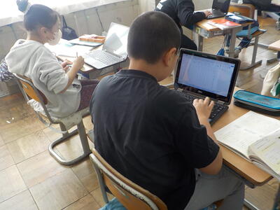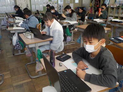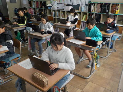 4年生は二クラスとも国語の授業。調べたことを作文にする活動を行っていました。原稿用紙ではなく、端末の「ワード」を使って作文をしていました。端末で作文することは、書き直しを含めた推敲が行いやすいので、メリットが大きいですね。