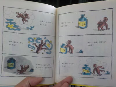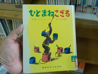 図書室にあった「ひとまねこざる」の本。おさるのジョージです。とっても有名な本なので多くの子供たちが手にしたことのある本だと思います。