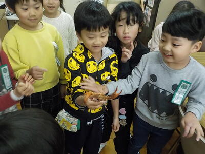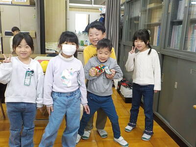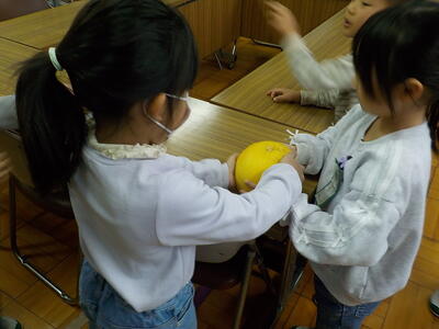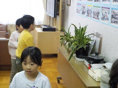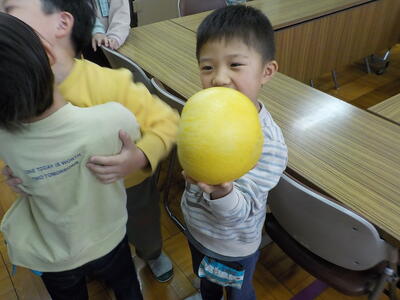 2時間目休みの時間、1年生たちが校長室に遊びに来てくれました😁。最後の日にも来てくれて嬉しかったです(^^)/。昨日いただいた「晩白柚(ばんぺいゆ)」を見て、その大きさにびっくりしていました。