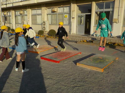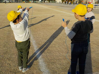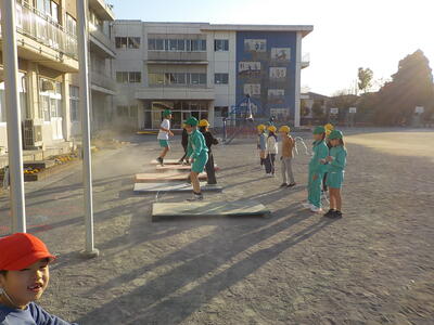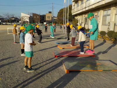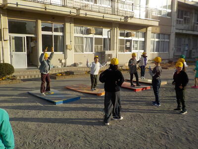 校庭では子供たちが短縄跳びの練習を頑張っています。先日出した「縄跳びジャンプボード」は、地面の上だと少し難しい技の練習ができるので、子供たちが並んでいます。ジャンプボードの「バッコーン、バッコーン」という音は、”学校の冬の音”ですね。