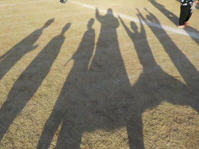 青空が広がっていて、長い影が芝生に落ちていたので、「影おくり」をしている子がいました。「影おくり」は、うまくできない子にとってはなんだかよく分からない遊びですが、うまく見えると、とっても不思議な感じがする遊びですね。
