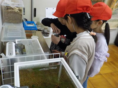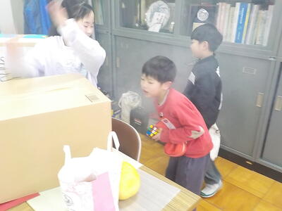 校長室に遊びに来た子たちと、久しぶりに「空気砲」にスモークを入れて遊んだり、金魚にアカムシをあげたりしました。