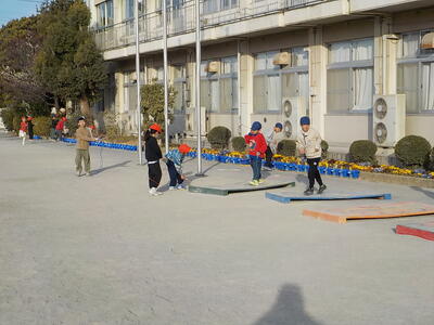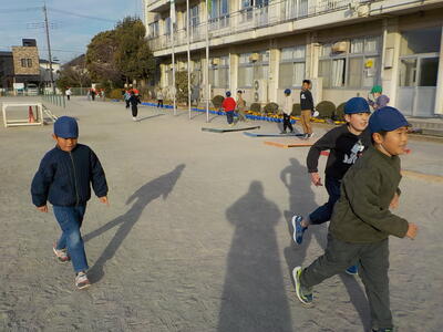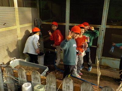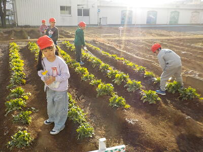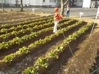 学年園では1年生が大根の水やりをしていました。一人5回ほどペットボトルで水をあげています。しっかりと世話をしているので、元気に育っています。「植えっぱなしにしないこと」は、子供たちに大切なことですね…。