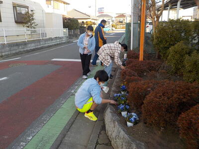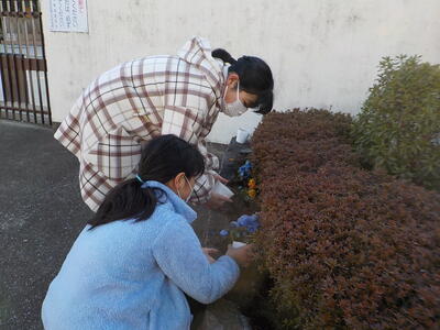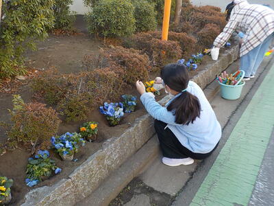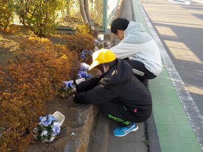 いただいたパンジーの苗を、正門の前の植木の下に植えました。ちょっとモノトーンだった正門付近が、ぱっと明るくなりました。環境委委員の皆さん、朝からありがとうございました。