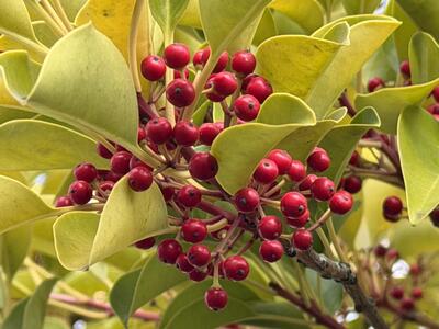 2月の寒さを受けて、クロガネモチの赤い実の鮮やかさが増したように見えます。青い空、葉の緑とのコントラストが鮮やかです。