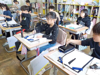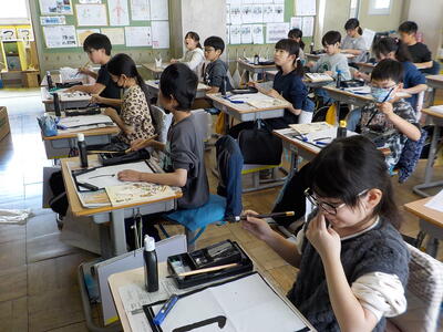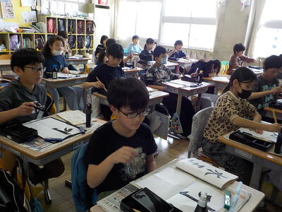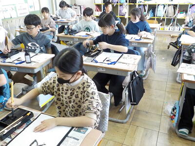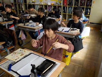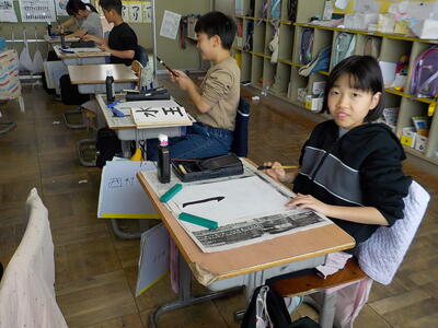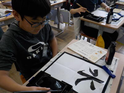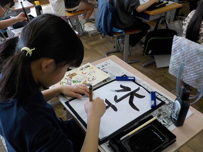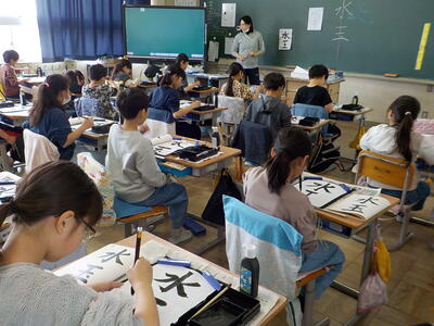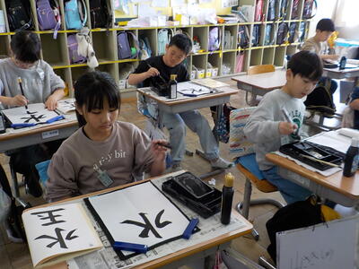 4時間目の3年生「書写」の時間です。3年生から始まった「毛筆」のまとめとして、『水玉』という字を書いていました。先生の説明をしっかり聞いて、一筆一筆ごとに集中して丁寧に書いていました。
