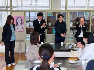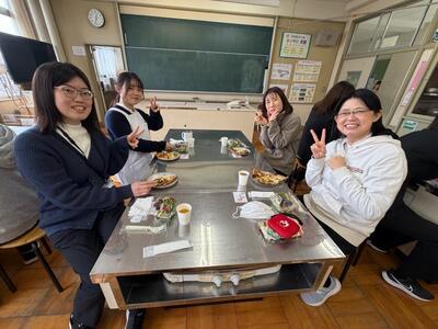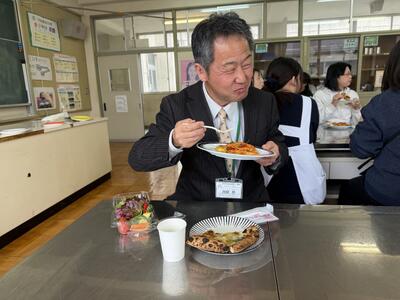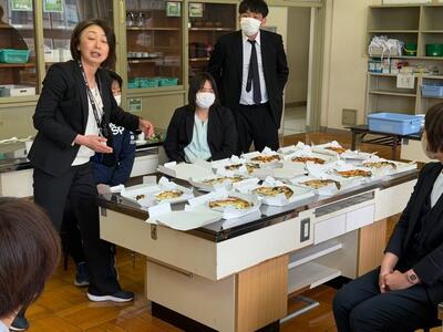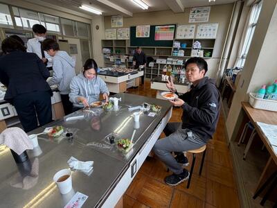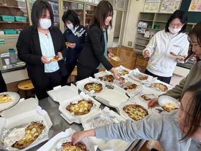 修了式の日の「昼食会」です。高学年ブロックの先生方の企画で、学校近くにあるイタリア料理店のシェフにわざわざ御来校いただき、家庭科室で作りたての美味しいお昼ご飯を頂きました。