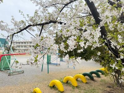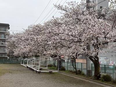 校庭東側のサクラは開花が進んでいます。4月8日前に見頃を迎えてしまうかもしれません。体力のない木は、花の蕾が開ききる前に、緑の葉を伸ばしてきています。