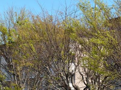 ケヤキの新芽も、日に日にたくさん芽吹いていて、遠目にも木が緑色に見えてきました。