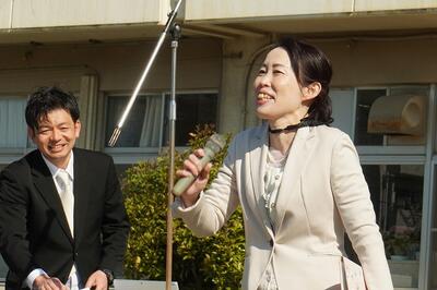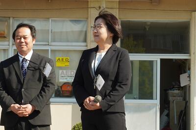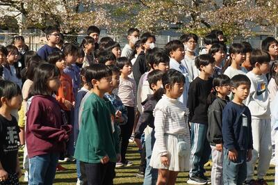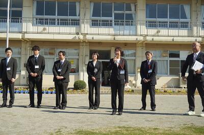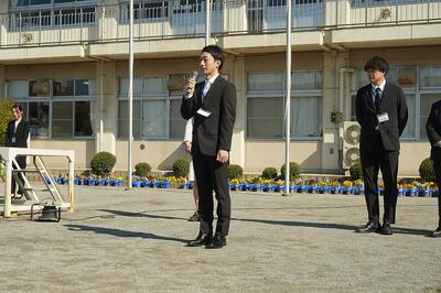 はじめに「着任式」で、学校を去られた先生と、新しく来られた先生の紹介をしました。