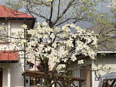 ちょっと雲の多い空ですが、ここ数日の暖かさが朝の空気に残っています。時折射し込む陽の光にハナミズキが明るく光り、なんともきれいです。