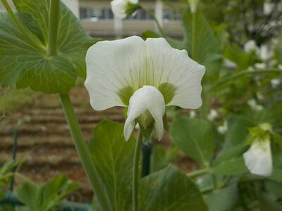 これは「エンドウ豆」の花です。虫を呼び寄せるためでしょぅか、小さくて可愛いけれども、なんとも怪しげな感じもする花ですね…。