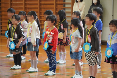 6年生に教室からエスコートされて入場した1年生たち、ちょっと緊張気味の表情😶でした。けれども、名前を呼ばれての「はい!😀」の返事は、全員しっかりとできました。そして、メダルと花の種をプレゼントされて、ちょっぴり笑顔☺️もこぼれていました。
