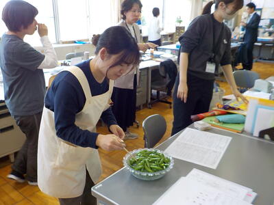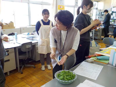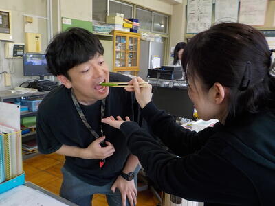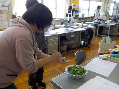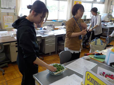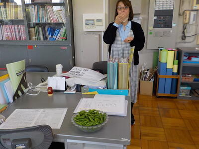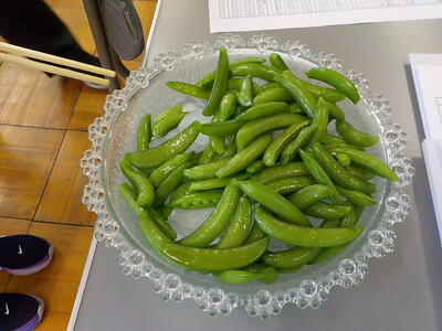 一瀬さんから「先生方で食べて!」ということで、再びエンドウ豆をいただきました。事務職員と栄養教諭が「すじ取り」をしてくれたのを鍋で茹でたのですが、ちょっと長く茹ですぎて、やや柔らかくなってしまいました…。でも、美味しさは変わらずで、”甘さ”を感じるエンドウ豆でした!(^^)!。これで、エンドウ豆の収穫は終わりのようです。一瀬さんありがとうございました(^^)/